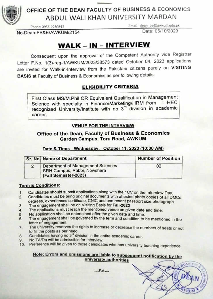 Abdul Wali Khan University Mardan requires visiting faculty for the Fall Semester 2025. Interested and eligible applicants are advised to appear for an interview in the concerned department as per the eligibility criteria and schedule below: